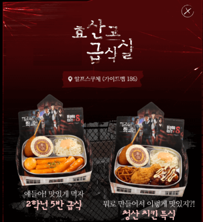 고등학생이면 4교시가 되면 배가 고프겠죠?? 그럴 땐 급식실에 방문하셔서 맛있는 급식을 드셔보세요. 과학쌤의 해독에이드, 복숭아 에이드, 치킨&철판김치볶음밥 등 다양한 메뉴가 준비되어 있습니다.