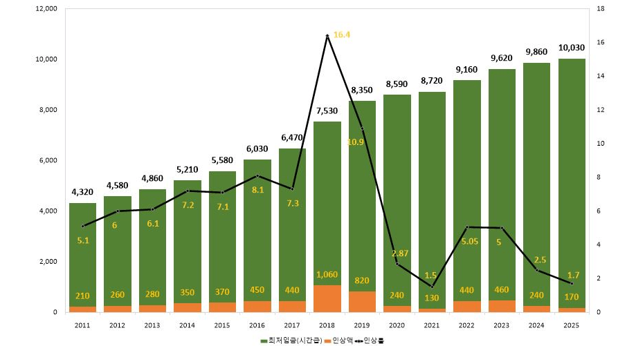 2024년 최저임금은 9,860원 으로, 2025년에는 170원이 증가하여 10,030원이 됩니다. 이 증가폭은 작지만, 전체적인 경제 상황과 물가 상승률을 고려할 때, 적절한 수준으로 평가되고 있습니다. 특히 인플레이션이 계속되고 있는 가운데, 최저임금의 인상은 저소득층의 생활 안정에 중요한 역할을 할 것으로 예상됩니다.
